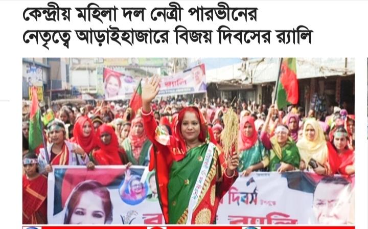 নারায়ণগঞ্জ জেলার আড়াইহাজার উপজেলায় নানা আয়োজনে উৎসবমুখর পরিবেশে মহান বিজয় দিবস পালন করেছেন বিএনপি'র মহিলা দলের কেন্দ্রীয় কমিটির সাংগঠনিক সম্পাদক পারভিন আক্তার।