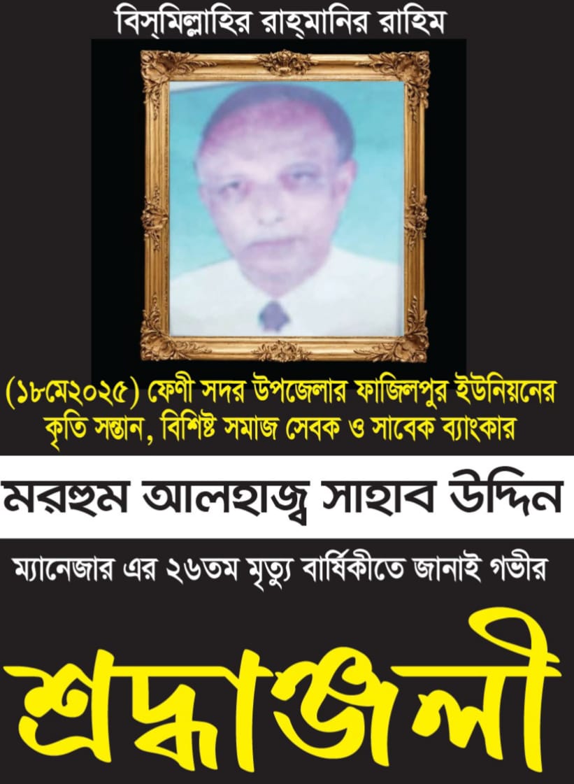 ফেনী সদর উপজেলার ফাজিল পুর ইউনিয়নের কৃতি সন্তান, বিশিষ্ট সমাজ সেবক, সাবেক রুপালী ব্যাংকের জেনারেল ম্যানেজার, মরহুম আলহাজ্ব সাহাব উদ্দিন ম্যানেজার এর ২৬ তম মৃত্যুবার্ষিকী।