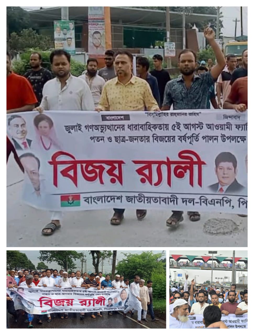 ৫ ই আগস্ট উপজেলার মোগরা পাড়া চৌরাস্তা জামে মসজিদের সামনে থেকে বিজয়ের র্যালীটি পিরোজপুর ইউনিয়ন পরিষদ চত্বর হয়ে ঢাকা-চট্টগ্রাম মহাসড়ক আজহারুল ইসলাম মান্নানের পক্ষে স্লোগানে স্লোগানে নেতাকর্মীদের বৃষ্টি ভেজা কন্ঠে ভরপুর চৌরাস্তা। নারায়ণগঞ্জের সোনারগাঁ উপজেলার বিএনপি'র সভাপতি আজহারুল ইসলাম মান্নানের নেতৃত্বে ফ্যাসিবাদ আওয়ামীলীগের সাবেক প্রধানমন্ত্রী শেখ হাসিনা সরকারের পতনের বর্ষপূতিতে বিজয় র্যালী বের করা হয়।এসময় উপস্থিত ছিলেন, সোনারগাঁ উপজেলা বিএনপির সাধারণ সম্পাদক মোশাররফ হোসেন, সিনিয়র সহ-সভাপতি কাজী নজরুল ইসলাম টিটু, যুগ্ম সম্পাদক আতাউর রহমান, সোনারগাঁ পৌর বিএনপির সভাপতি শাহজাহান মিয়া, সাবেক সহ-সভাপতি, নারায়ণগঞ্জ জেলা ছাত্রদল শাহাদাত হোসেইন, বৈদ্যেরবাজার ইউনিয়ন বিএনপির সভাপতি তাজুল ইসলাম সরকার, পিরোজপুর ইউনিয়ন বিএনপির সভাপতি মনিরুজ্জামান, সাধারণ সম্পাদক জয়নাল আবেদীন, সোনারগাঁ উপজেলা বিএনপির প্রচার সম্পাদক সেলিম হোসেন দিপু, নারায়ণগঞ্জ জেলা যুবদলের সিনিয়র যুগ্ম আহবায়ক খায়রুল ইসলাম সজিবসহ, খাইরুল ইসলাম কিরন,মো: রফিকুল ইসলাম ( বিডিআর) পিরোজপুর ইউনিয়ন সাবেক চেয়ারম্যান , তুমিজ উদ্দিন, সদস্য মো: বাসেত মিয়া ৭ নং পৌর সভাপতি, মো: শাজাহান,৭ নং পৌর, সদস্য, বিল্লাল হোসেন ভুবন, ৭ নং পৌর সদস্য মো: জজ মিয়া সাদিপুর ইউনিয়ন বিএনপির সদস্য, মো:মান্নান ভারপ্রাপ্ত চেয়ারম্যান, উপজেলা বিএনপির অঙ্গ সংগঠনের নেতা-কর্মীরা