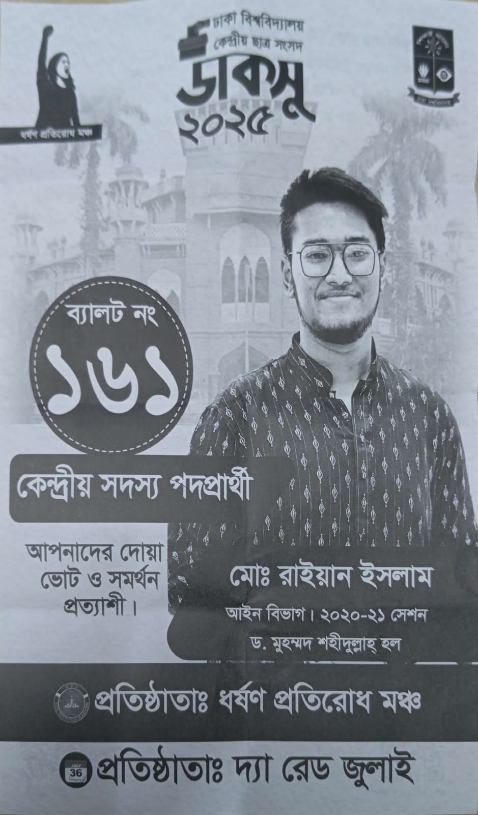 ষ্টাফ রিপোর্টারঃ--ডাকসু'র ভূয়া প্রার্থীতা দাবী করা চাঁদাবাজ কে এই রাইয়ান ইসলাম? সরেজমিনে জানা যায়, রাইয়ান ইসলাম নারায়ণগঞ্জের প্রাইভেট বিশ্ববিদ্যালয় R. P. Shaha University র আইন ও মানবাধিকার বিভাগের ২৭ ব্যাচের শিক্ষার্থী। অথচ সে তার নির্বাচনী প্রচারপত্রে দাবি করেছে ঢাকা বিশ্ববিদ্যালয়ের আইন বিভাগের ২০২০-২১ সেশনের শিক্ষার্থী। এবং তার হল সংযুক্তি দেখানো হয়েছে শহীদুল্লাহ হল। অথচ শহীদুল্লাহ্ হলে আইন বিভাগের শিক্ষার্থীদের সংযুক্তি দেওয়া হয় না। নিবার্চনী প্রচারপত্রে তার ব্যালট নং দেখানো হয়েছে ১৬১। সে নিজেকে রেড জুলাইয়ের প্রতিষ্ঠাতা দাবি করেছে।