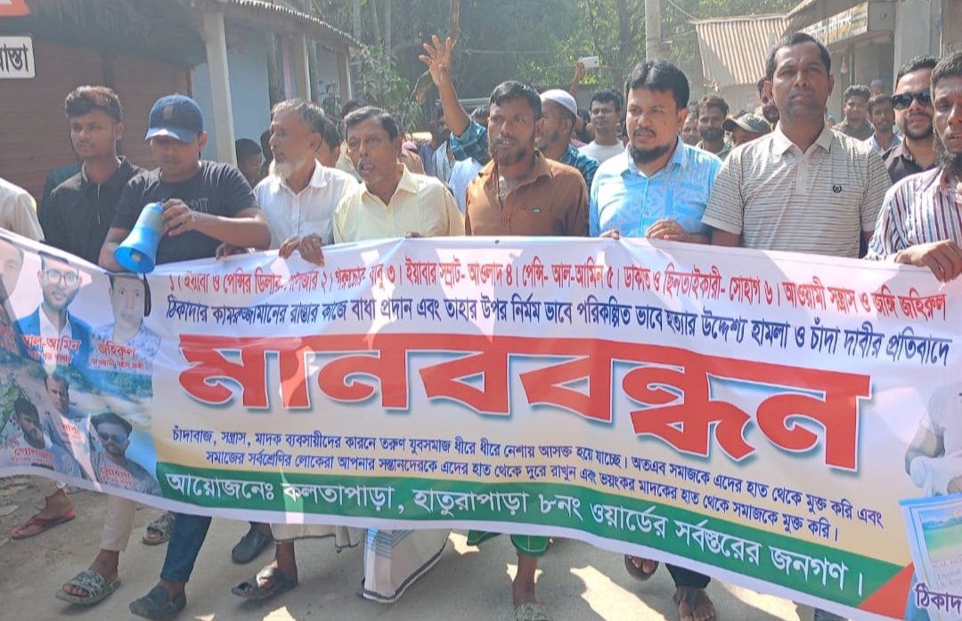 নারায়ণগঞ্জের সোনারগাঁ উপজেলার জামপুর ইউনিয়নের কলতাপাড়া গ্রামে চাঁদাবাজি ও সন্ত্রাসী কর্মকাণ্ডের প্রতিবাদে এক মানববন্ধন অনুষ্ঠিত হয়েছে। সোমবার সকালে তারিখ ২৭/১০/২০২৫ ইং সকাল ১০টায় মিরেরটেক এশিয়ান হাইওয়ে সড়কের পাশে এলাকাবাসীর আয়োজনে এ মানববন্ধন অনুষ্ঠিত হয়।