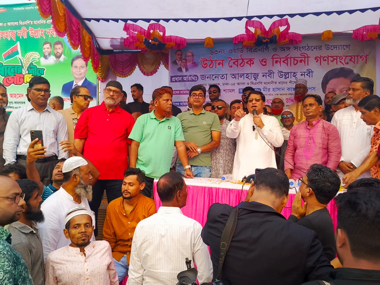 প্রধান অতিথি আলহাজ্ব নবী উল্লাহ নবী তার বক্তব্যে বলেন আমি আপনাদের এই এলাকার সন্তান আমি জানি আপনাদের এলাকায় কোথায় কোন সমস্যা রয়েছে আমি নির্বাচিত হতে পারলে সকল সমস্যার সমাধানে চেষ্টা করব ইনশাল্লাহ। তিনি জামাতে ইসলামের সমালোচনা করে বলেন তারা নির্বাচনের নামে জান্নাতের টিকিট বিক্রি করে তিনি এই ধর্ম ব্যবসায়ী দলের ব্যাপারে সকলকে সজাগ থাকতে অনুরোধ করেন। তিনি বিএনপি'র নেতাকর্মীদের ঢাকা ৫ আসনের প্রত্যেকটি মানুষের বাড়ি বাড়ি গিয়ে নির্বাচনের প্রচারণা চালাতে নির্দেশ প্রদান করেন।