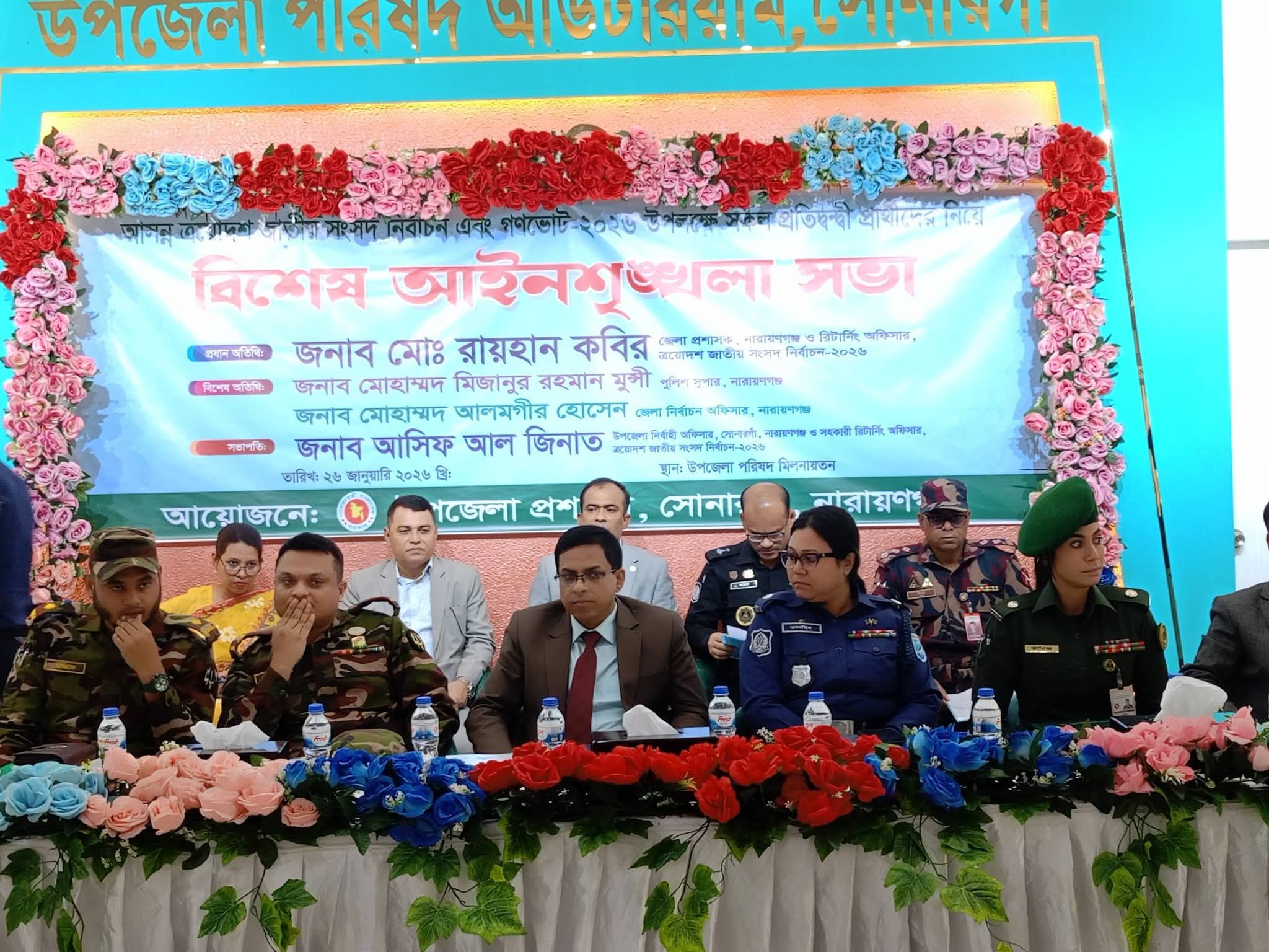 সভায় সভাপতিত্ব করেন জনাব আসিব আল জিনাত, উপজেলা নির্বাহী অফিসার, সোনারগাঁ, নারায়ণগঞ্জ। সভাপতির বক্তব্যে তিনি বলেন, একটি অবাধ, সুষ্ঠু ও নিরপেক্ষ নির্বাচন আয়োজনের জন্য উপজেলা প্রশাসন, আইনশৃঙ্খলা বাহিনী ও নির্বাচন সংশ্লিষ্ট সকল দপ্তর সমন্বিতভাবে কাজ করছে।