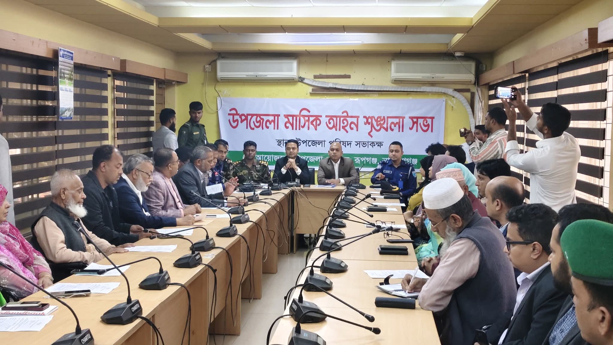 নারায়ণগঞ্জের রূপগঞ্জ উপজেলা প্রশাসনের উদ্যোগে উপজেলা মাসিক আইন-শৃঙ্খলা সভা অনুষ্ঠিত হয়েছে। সভায় আসন্ন জাতীয় সংসদ নির্বাচনকে সামনে রেখে উপজেলার সার্বিক আইন-শৃঙ্খলা পরিস্থিতি পর্যালোচনা এবং নির্বাচনকে ঘিরে নিরাপত্তা ব্যবস্থা জোরদার করার বিষয়ে বিস্তারিত আলোচনা করা হয়।